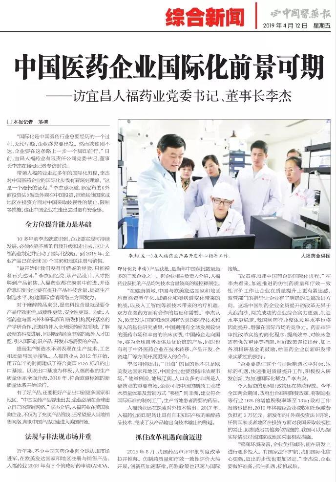 “国际化是中国医药行业总要经历的一个过程,无论早晚,企业终究要出发。然而欲速则不达,企业要在这条路上一步一个脚印前行。”日前,熊猫体育集团总裁、宜昌人福药业有限责任公司党委书记、董事长李杰在接受记者专访时说。